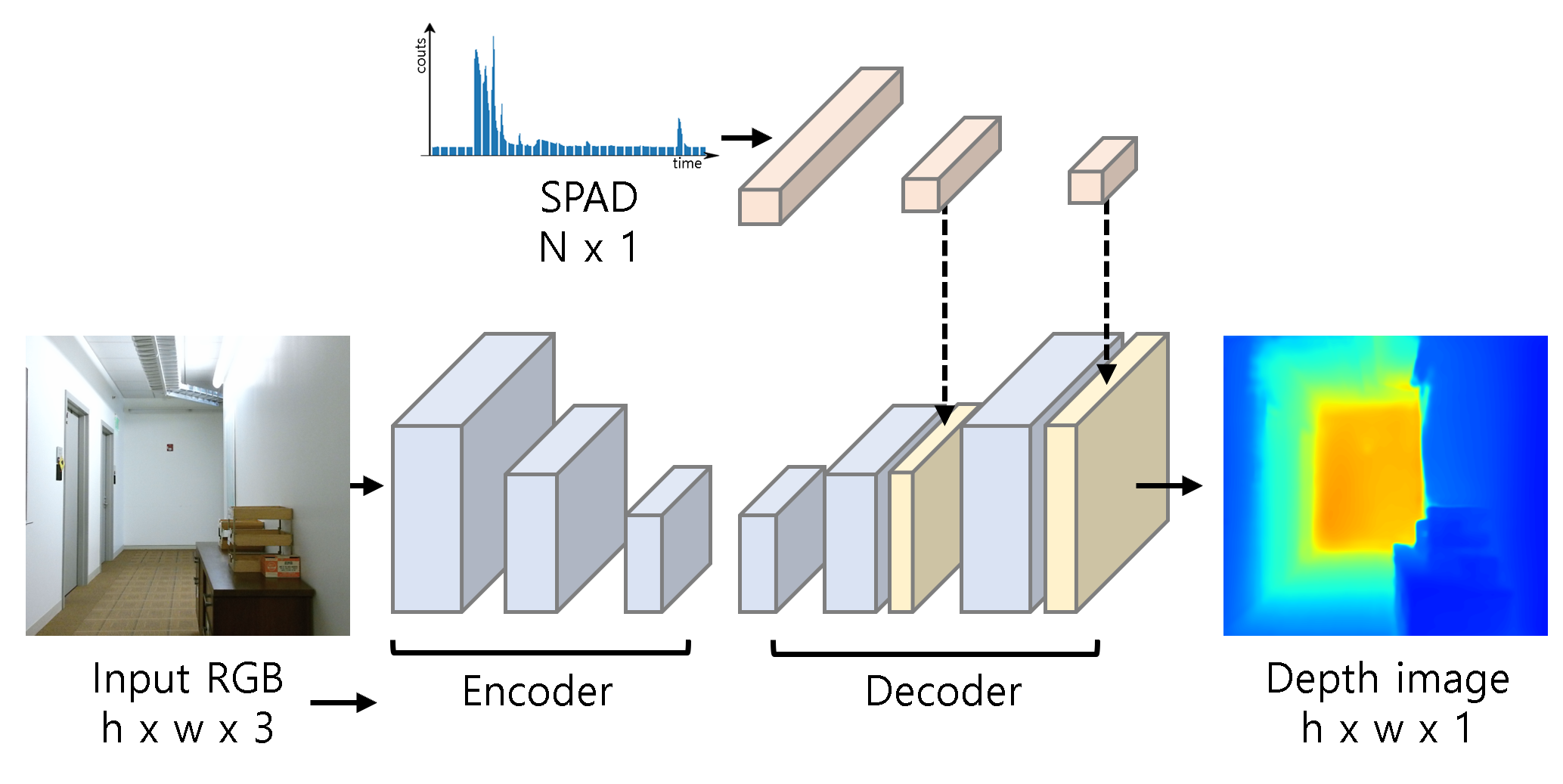 Monocular Depth Estimation Network with Single-Pixel Depth GuidanceLee, Hongjae, Park, Jinbum, Jeong, Wooseok, and Jung, Seung-WonOptics Letters 2022Due to the scale ambiguity problem, the performance of monocular depth estimation (MDE) is inherently restricted. Multi-camera systems, especially those equipped with active depth cameras, have addressed this problem at the expense of increased hardware costs and space. In this Letter, we adopt a similar but costeffective solution using only single-pixel depth guidance with a single-photon avalanche diode. To this end, we design a single-pixel guidance module (SPGM) that combines the global information from the single-pixel depth guidance with the spatial information from the image at the feature level. By integrating SPGMs into an MDE network, we introduce PhoMoNet, the first end-to-end MDE network with single-pixel depth guidance. Experimental results show the effectiveness and superiority of PhoMoNet over state-of-the-art MDE networks on synthetic and real-world datasets.